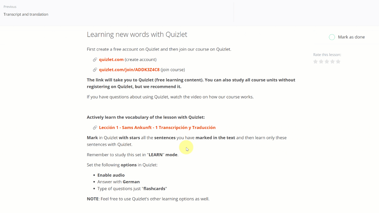 The link will take you to Quizlet (free learning content). You can also study all course units without registering on Quizlet, but we recommend it.